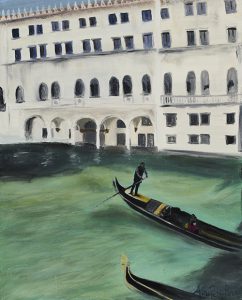 “ Párizsban élek , viszont részben Budapesten nőttem fel, családom most is itt él, így ez a két város rendkívül fontos inspirációs forrás nekem. Évente többször megfordulunk a férjemmel Olaszországban, de ezek mellett a fix lokációk mellett szeretek újabb és újabb desztinációkat felfedezni, legyen az egy egzotikus ország Ázsiában vagy egy másik európai metropolisz. A látvány, a színek, a természet mindig megihlet, igyekszem ezeket a képeket, az ott ért pillanatokat a saját perspektívámon, szemüvegemen keresztül, a személyes lenyomatommal megörökíteni .Több képemen a családtagjaim vagy saját magam sejtelmesen ábrázolt alakját lehet felfedezni..” – mesél a számásra fontos helyszínekről, inspirációs forrásokról a 33 éves festőművésznő.